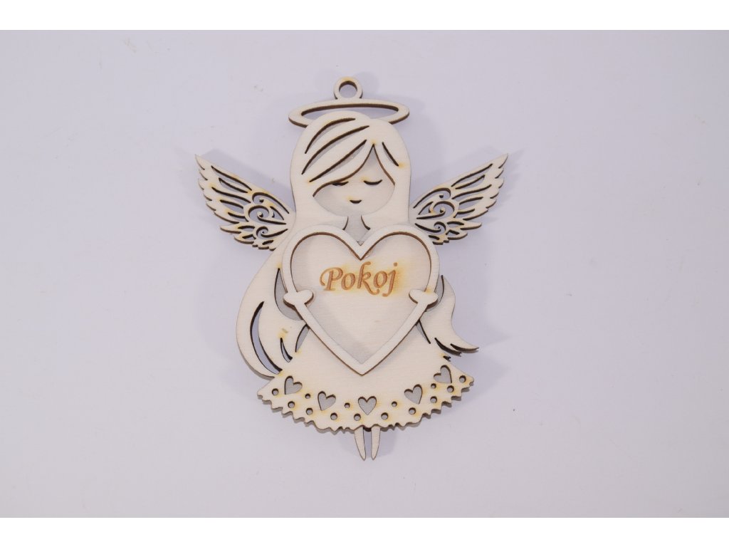 Trojvrstvový drevený anjelik s motívom „Pokoj“. Prírodná ozdoba s jemným gravírovaním.