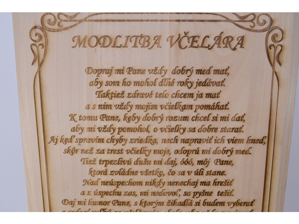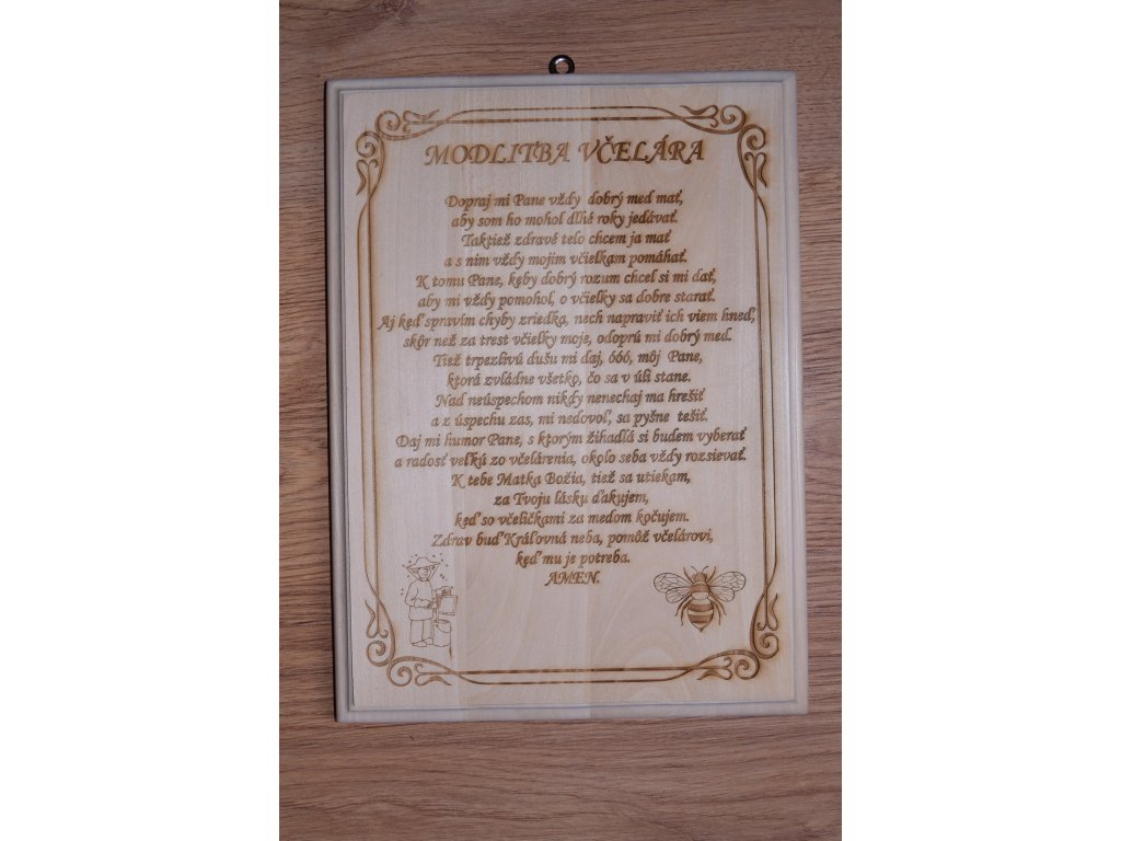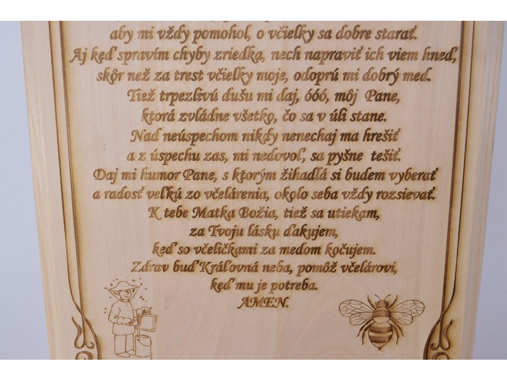 Text je gravírovaný do kvalitného dreva laserom, čo mu dodáva elegantný a trvácny vzhľad. Rámovanie a drobné detaily – včielka a včelár – podčiarkujú symboliku oddanosti, pokory a lásky k prírode.