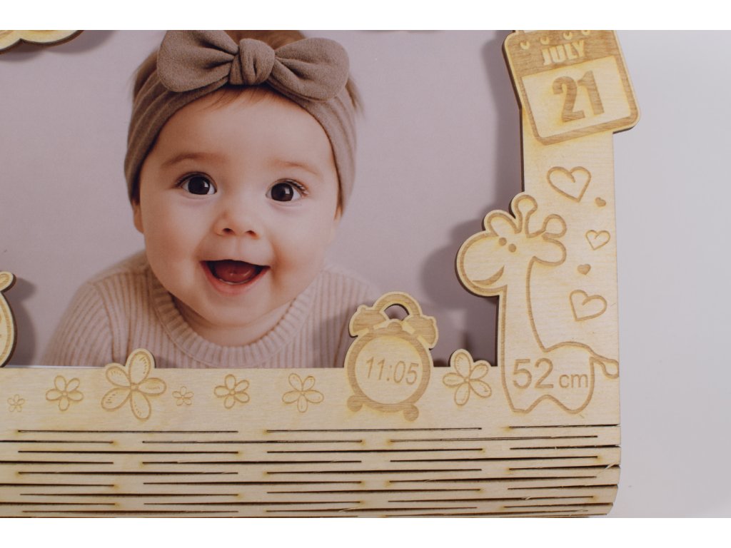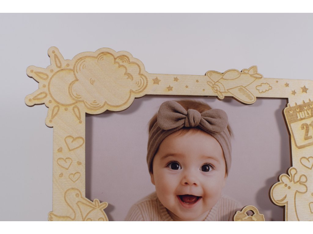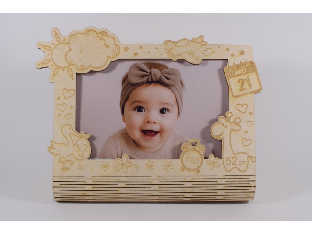 Rámček je vyrobený z kvalitnej preglejky a zdobený jemnými detskými motívmi. Fotografia sa jednoducho vkladá zozadu a rámček je postavený na stabilnom stojančeku, vďaka čomu je vhodný na poličku, komodu alebo do detskej izby.