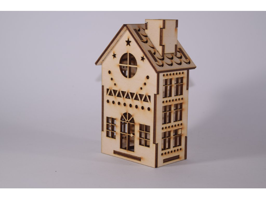 Vyšší domček s jemne vyrezávanými okienkami, vhodný na LED svetielko. Ideálny na tvorenie a vianočné dekorácie.