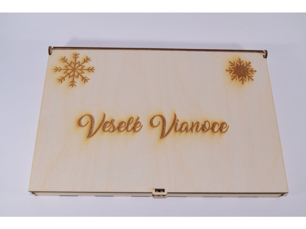 Všetky ozdoby sú uložené v drevenej krabičke s rozmerom 28 × 18 × 2,5 cm, rozdelenej na 6 elegantných priehradiek, v ktorých sú ozdoby prehľadne roztriedené po 3 kusoch. Krabička nielenže pôsobí luxusne, ale zároveň chráni ozdoby pred poškodením a uľahčuje ich uskladnenie po sviatkoch.