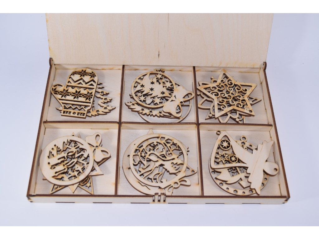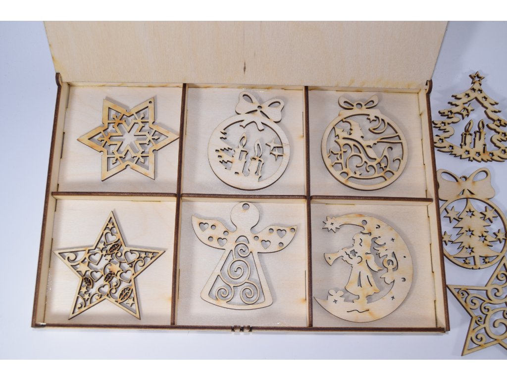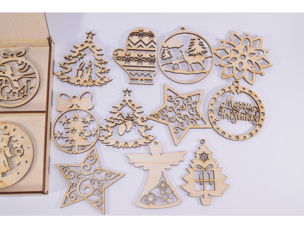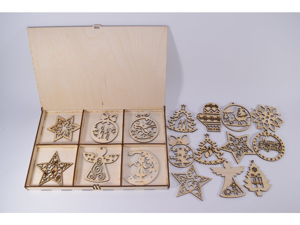 Sada obsahuje 18 kusov drevených ozdôb s veľkosťou 7,5 cm, vyrezávaných laserom s vysokou presnosťou. Každá ozdoba má svoj jedinečný motív – vločky, stromčeky, jeleň, anjelik a ďalšie klasické symboly Vianoc.