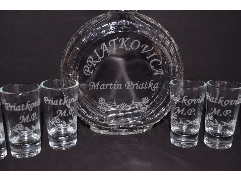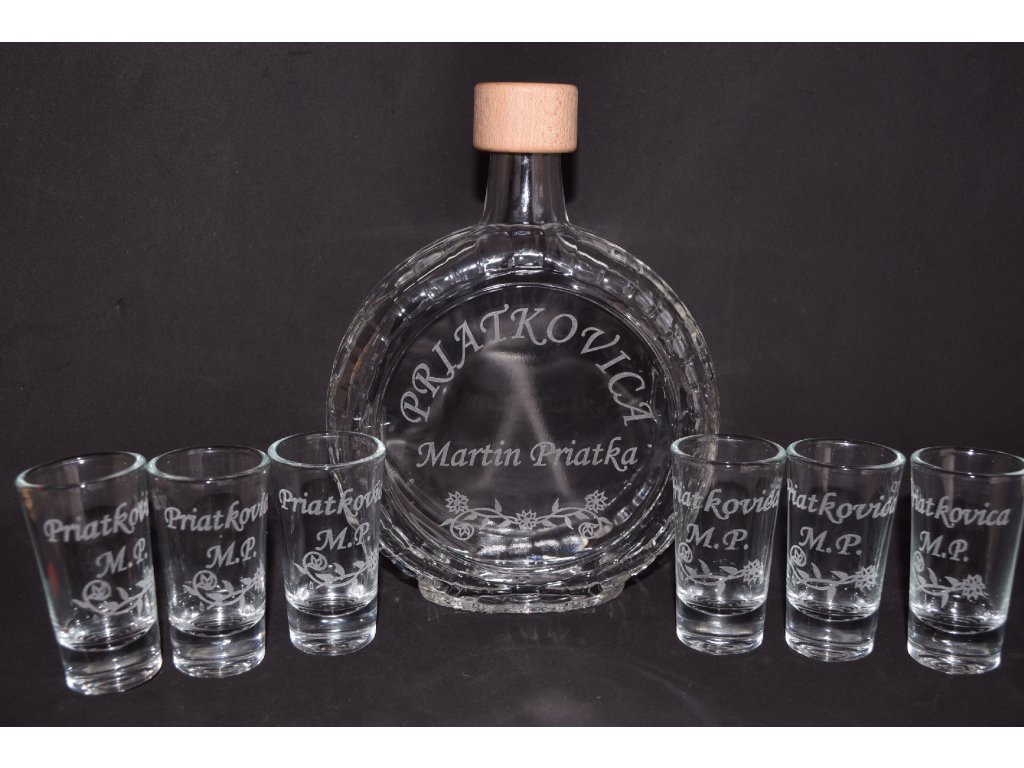 Elegantná sada fľaše a 6 pohárikov s gravírovaním podľa želania je skvelým darčekom pre každého, kto si rád vychutná pohárik v spoločnosti priateľov.