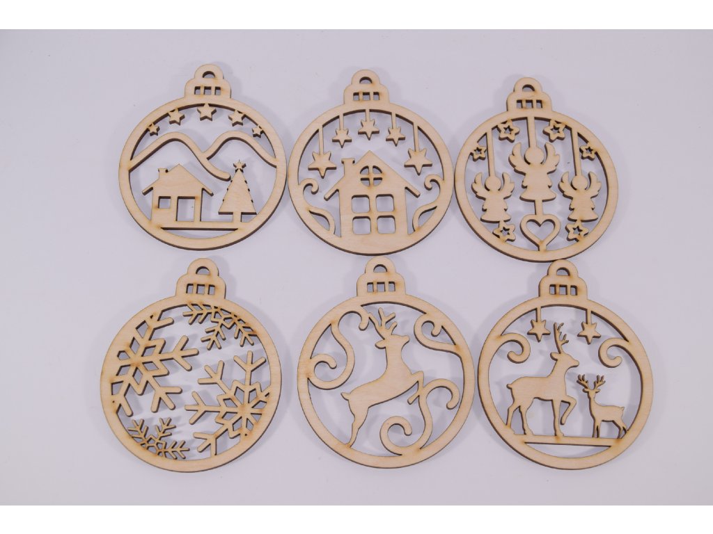 Sada 6 vyrezávaných drevených ozdôb v tvare gule s rôznymi vianočnými motívmi prinesie do vášho domova teplo a čaro tradičných Vianoc. Ideálne na stromček, okno či ďalšie tvorenie.