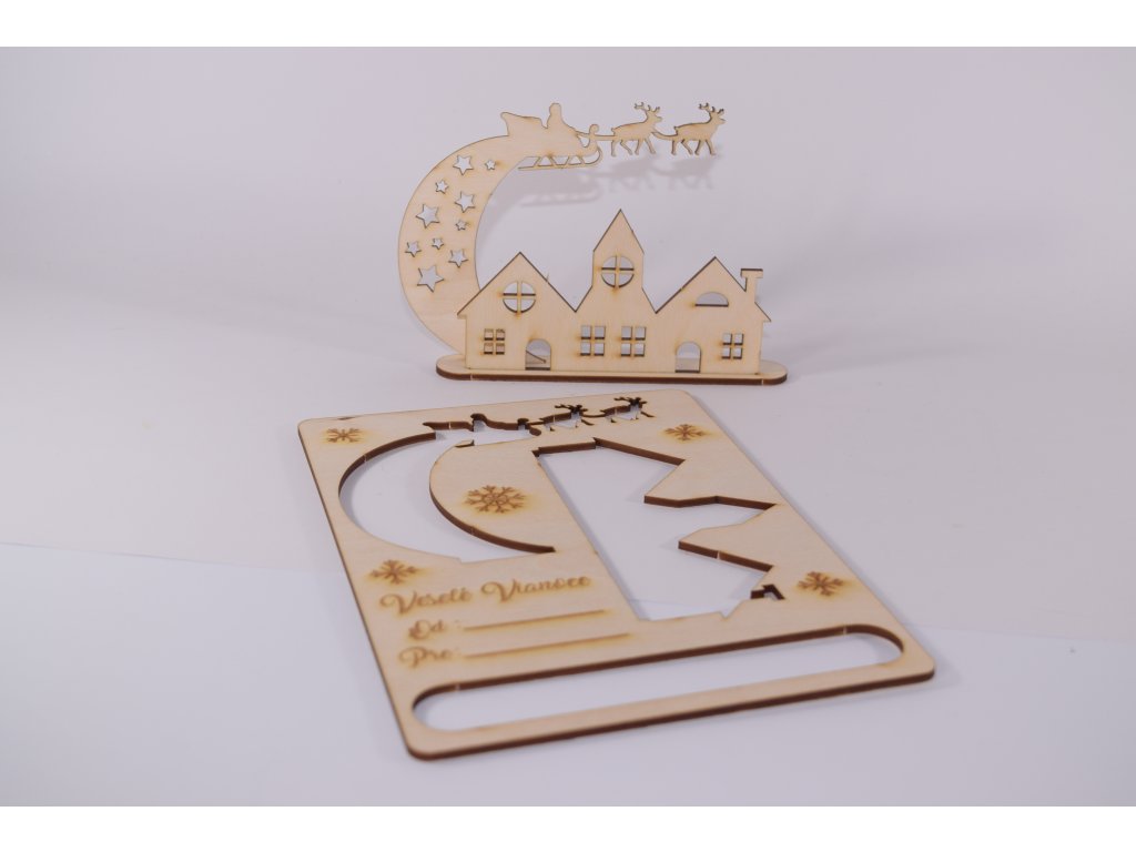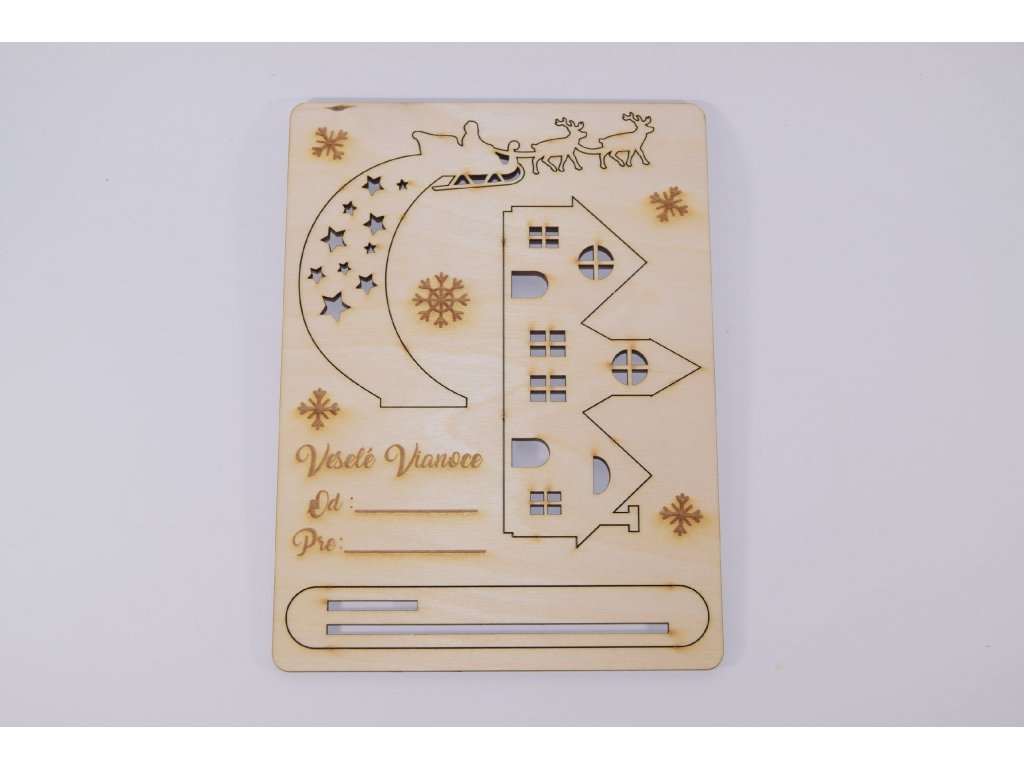Pozdrav má tvar formátu A5 a je vyrezávaný laserom z brezovej preglejky.